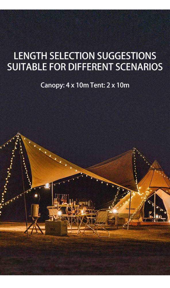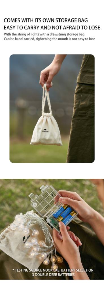 NATUREHIKEМайхан, сүүдрэвч чимэглэл орчны гэрэлтүүлэгээр ашиглана 80 ширхэг том бөмбөлгөн гэрэл бүхий 10м урт чимэглэлийн гэрэл Энгийн АА баттерейгаар 50 цаг хүртэл асна Авч явхад авсаархан эвхэж хураахад амархан